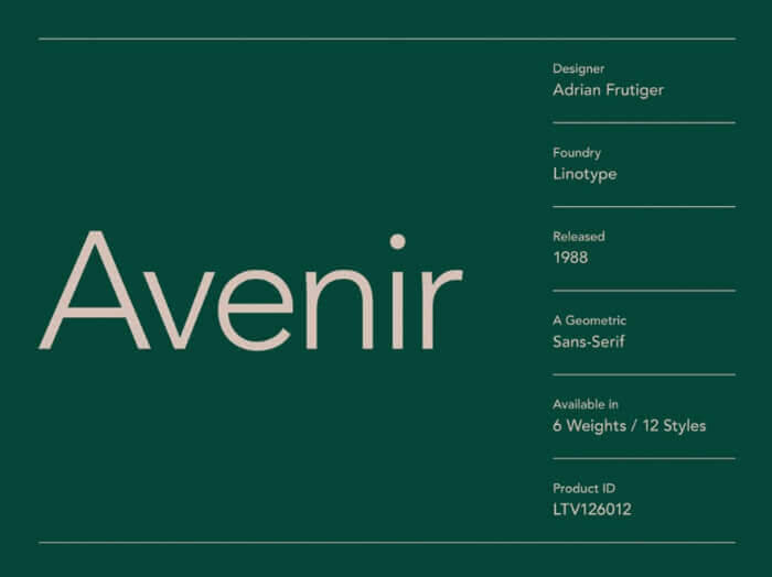 Designer Adrian Frutiger looked for inspiration to both the past and the future when creating the Avenir typeface. He wanted to reinterpret the geometric sans serif fonts from the early 20th century but infuse 21st-century aesthetics.