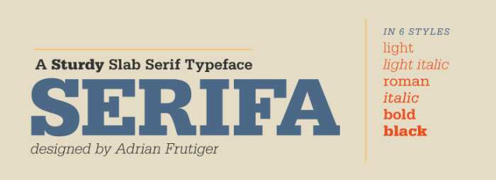 Serifa is another typeface designed by the iconic Adrian Frutiger. It’s a slab serif typeface with a sturdy character. It is loosely based on the Univers font family, also by Frutiger, and other older slab serif fonts. It offers legibility that heavier slab serif and serif fonts lack, but it still manages to be comfortable and elegant.