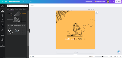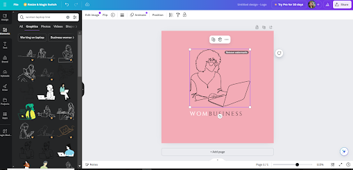 Of course, I don’t have curly hair or glasses so I’d explore further options. I’ll search some of Canva’s design elements by typing in a prompt like “woman laptop line” to get more options for similar line illustrations.