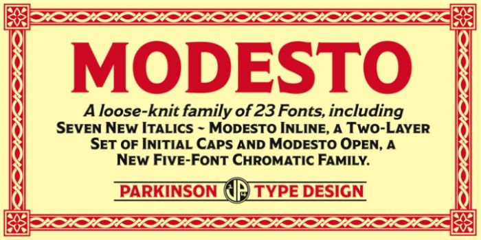 This font family by Jim Parkinson is directly inspired by hand-painted typography and the logos of Ringling Bros. and Barnum & Bailey Circus. The designer didn’t plan to create the Modesto Family, but he kept releasing 23 fonts in a time period of twelve years: from 2000 to 2012.