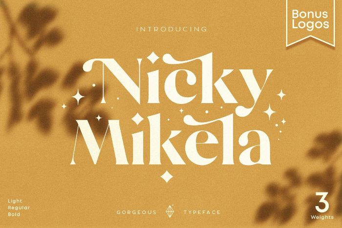 Nicky Mikela is a bold and elegant font with vintage elements. It is distinguishable because of its beautiful ligatures, alternative glyphs, and decorative elements. It is a pretty and versatile font great for the logo design for beauty, fashion or cosmetic company or retail store.