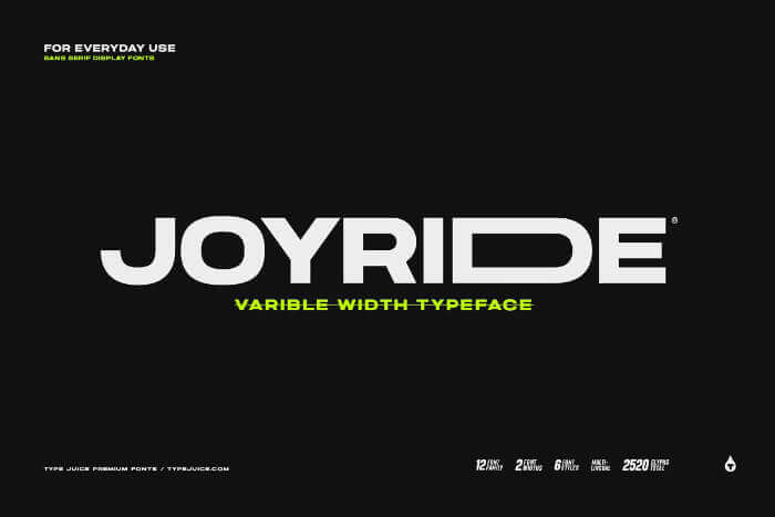 Joyride is a sans serif typeface that is unique because of its variable width. It includes 12 fonts with a variety of styles. The uppercase letters in each of the styles are extended to allow easy customization and control of the width of each character.