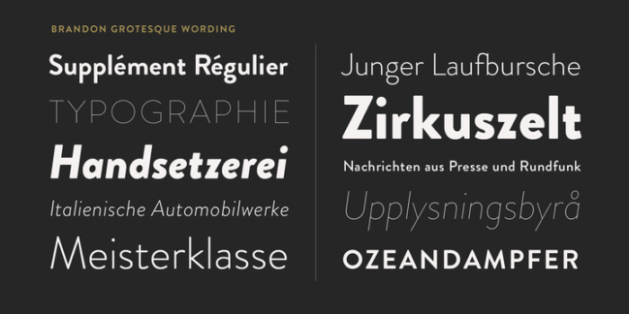 Brandon Grotesque breaches influence from geometric style sans serif typefaces from the 1920s and 30s. These fonts were mainly based on geometric forms that were optically corrected for legibility. It has a small x-height and restrained forms, that give this font a noticeable elegance.