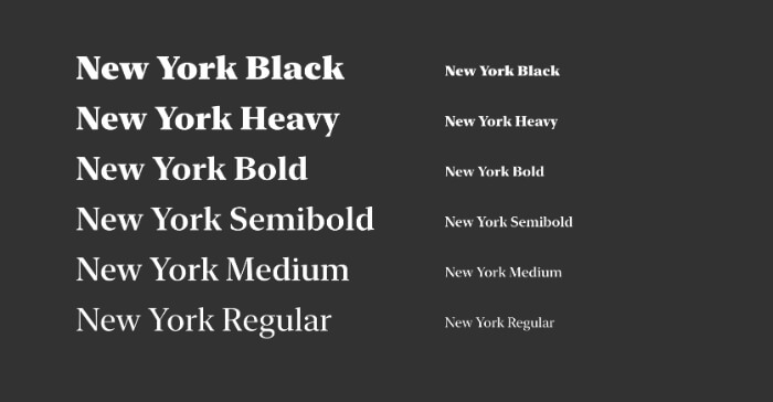 New York is another typeface by Apple, but contrary to Garamond, the company made this one free for use. It is a revamped version of a 1984 font created by Susan Kare, best known for creating the Mac icons. This digital revamp of the old serif font keeps its nostalgic elements but offers a modern simplicity.