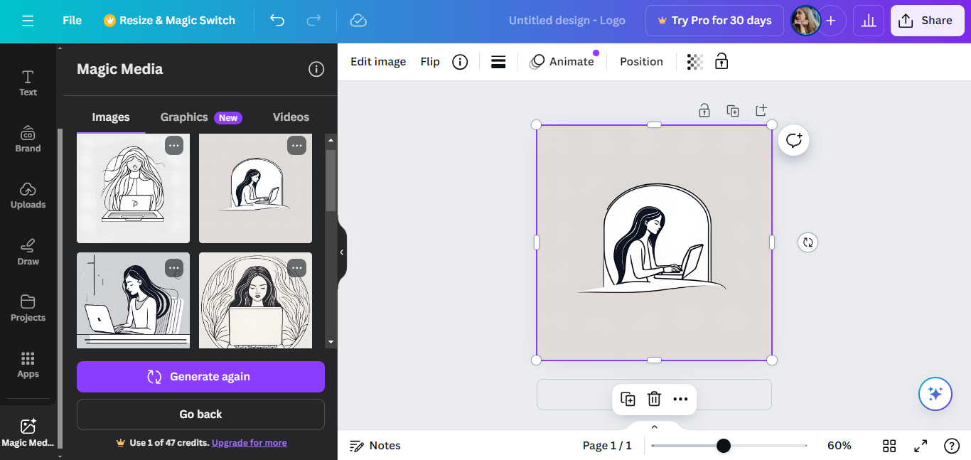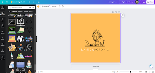 Of course, I don’t have curly hair or glasses so I’d explore further options. I’ll search some of Canva’s design elements by typing in a prompt like “woman laptop line” to get more options for similar line illustrations.